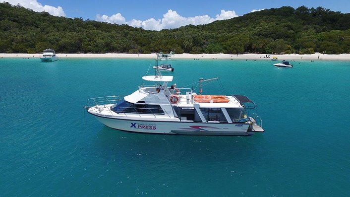 On the scenic cruise from Airlie Beach you'll pass many spectacular Whitsunday Islands, including Daydream & Hamilton Island Resorts. Cross the Whitsunday Passage and cruise the full length of Whitehaven Beach. The fiberglass vessel will keep you safe in all conditions. There is space to sit upstairs with the captain, inside the main saloon or out back on the main deck. A bar service and toilets are also on board.